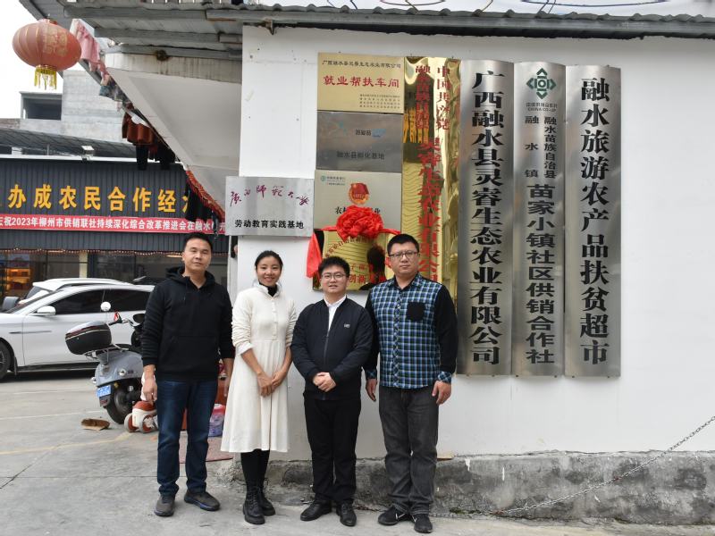 十三时三十分,韩明威老师和辅导员到访融水苗家小镇社区供销合作社,并送来牌匾。黄蕊莎校友邀请韩明威老师和辅导员参加揭牌、挂牌仪式,并合影留念。随后,韩明威老师和辅导员同黄蕊莎校友进入会客厅深入交谈。韩老师指出,实践是历练,是机遇,劳动实践可以使同学们多一份熟练,多一份沉稳,可以使同学们在实践中认清自身能力,看清市场需求,理清职业规划。社会不断发展,时代滚滚向前,同学们跟随时代浪潮,唯有警惕娱乐至死,走出享乐舒适圈,破而后立,谋而后动,才能在实践中不断自我调整,自我超越。青年影响时代,时代促就青年,同学们应争做时代的弄潮儿,奋步走在时代发展前头。黄蕊莎校友也表示:“我很荣幸能成为广西师范大学的一份子,大学生意味着未来社会的发展基础,国家发展的速度方向,让同学们可以在劳动教育实践基地中成长,是我对教育事业的微薄贡献。”
