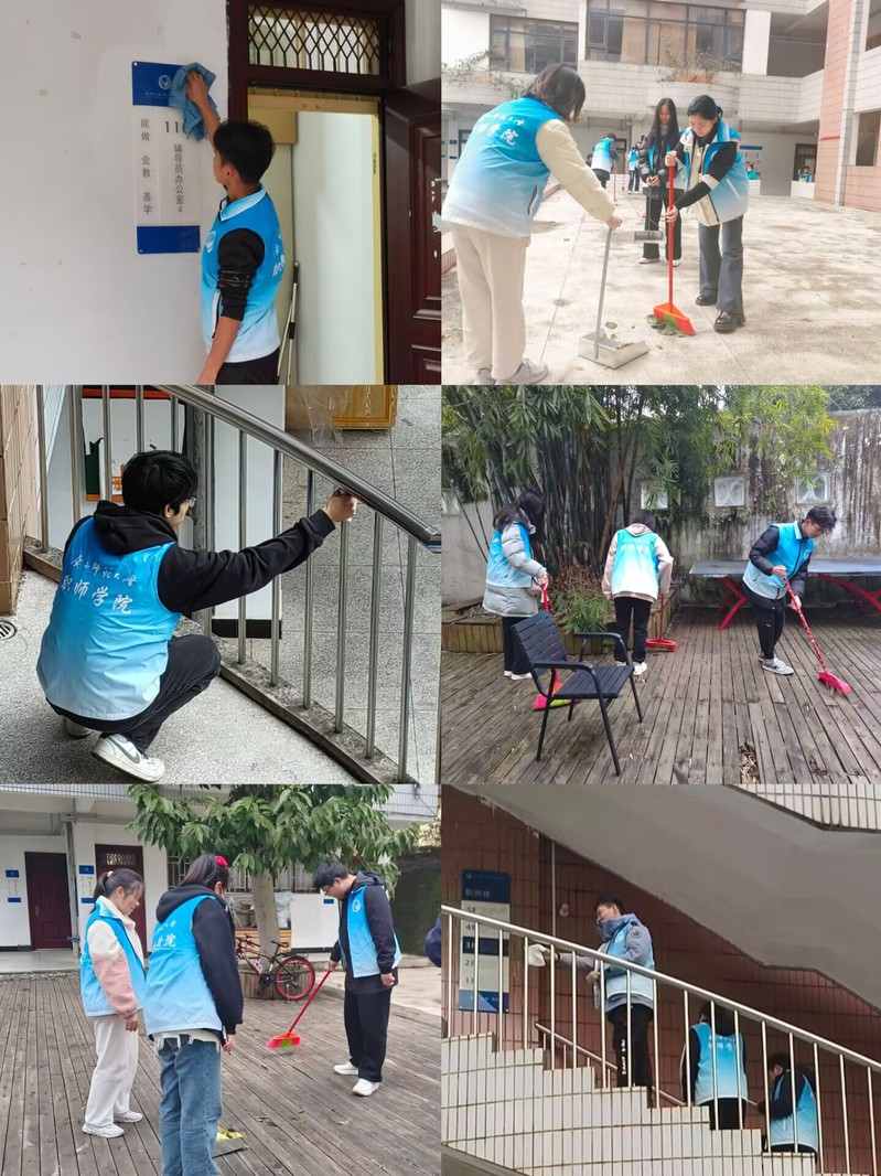 活动现场,大家手拿抹布、扫帚、垃圾袋等工具,分工明确,积极投入清扫工作,对学院各办公室、实训室、教室及学院周边区域进行集中清洁。他们有的拿起扫把清扫落叶和垃圾,有的拿起抹布擦拭门窗和桌椅,有的则负责搬运垃圾和整理物品,每个人都以饱满的热情和认真的态度投入到此次活动中,为共建美好校园贡献自己的一份力量。