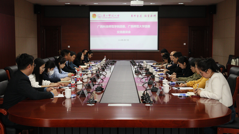 3月27日上午,广西科技师范学院团委一行到我校开展团学工作调研交流。交流座谈会于雁山校区图书馆第二会议室进行。校团委各科室负责人及部分学院团委负责人参加座谈会,座谈会由我校团委主要负责人主持。