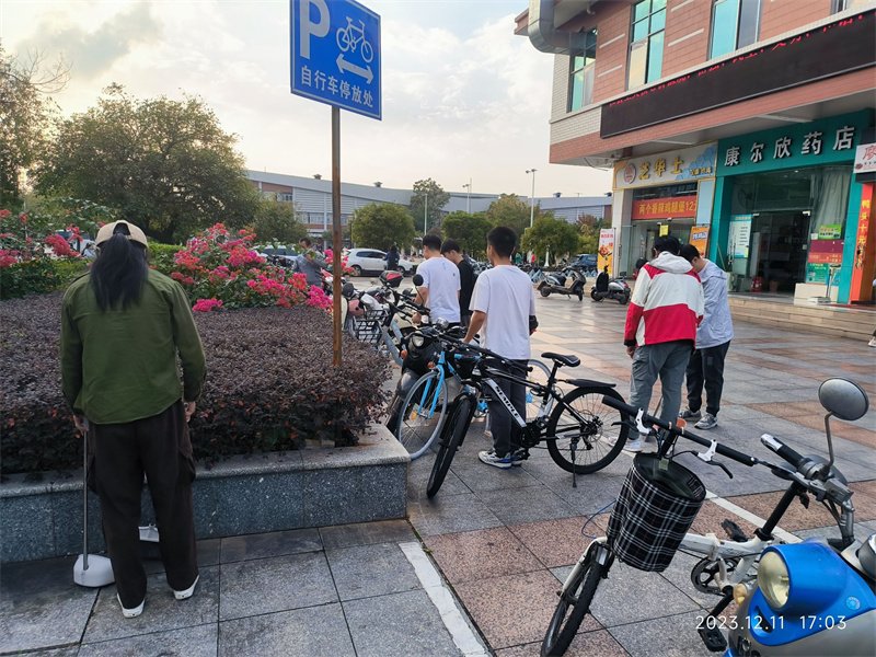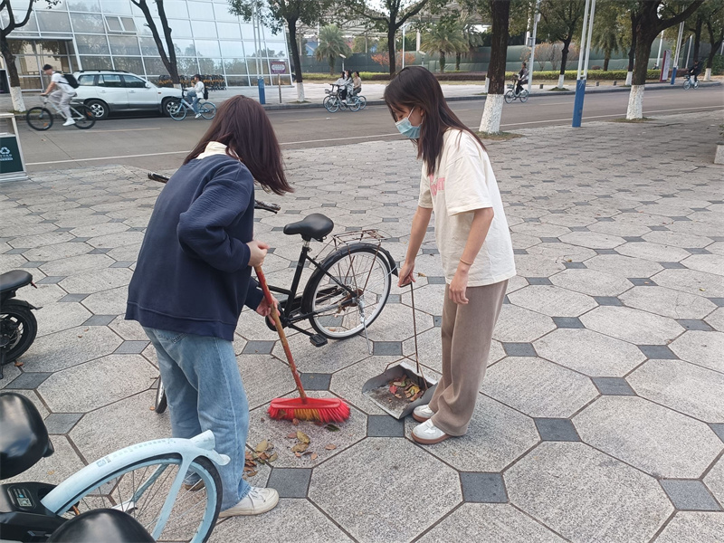 近日来,桂林的天气复杂多样,大风把部分单车吹倒,地上满是落叶。支部成员们团结合作,积极作为,有序推进志愿服务。支部成员们采取两人合作的方式,分别从车头、车尾位置调整自行车停放方位;受天气影响,地板上枯枝落叶极多,并且随时落下,支部成员不辞辛苦、耐心细致地将垃圾扫除,充分发扬了吃苦耐劳、辛勤劳作的志愿者精神。