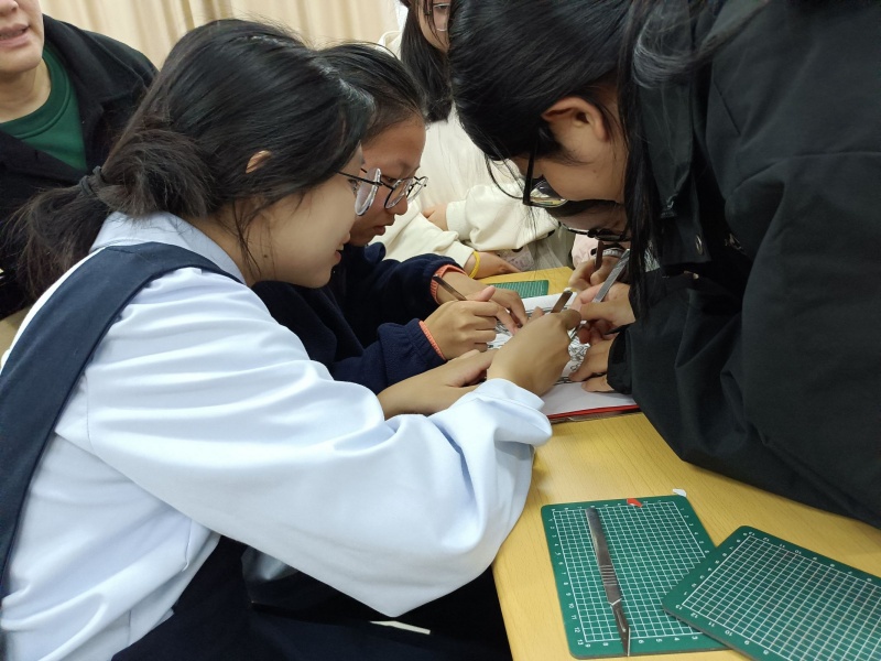 随后,剪纸实践环节正式拉开帷幕。剪纸协会办公室成员们早已将剪纸所需的工具,如刻刀、垫板等准备好,等待协会成员领取。工具领取完后,参与者们又挑选自己心仪的图样。参与者们分组协作,迅速投入到热闹而愉快的创作活动之中。小组内,成员们紧锣密鼓,细致认真地进行雕刻,刻刀像一位技艺高超的舞者,在纸上舞动。而设计部的成员们,穿梭于各个小组之间,将自己平日里积累的“独门秘笈”倾囊相授。从刻刀的正确握法到线条的精细雕琢,她们耐心地讲解、示范,助力每一位参与者完成自己的作品,让传统剪纸艺术在冬日里绽放出别样的光彩。