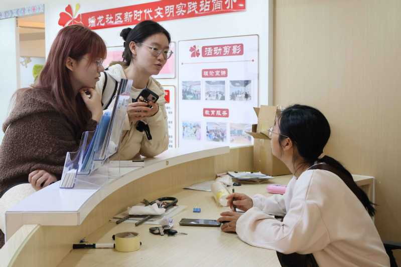 团队成员在蟠龙社区新时代文明实践站和社区工作人员交流