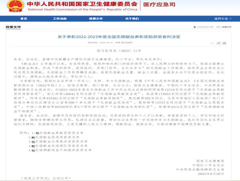 据悉,此次国家级表彰严格遵循《中华人民共和国献血法》《全国无偿献血表彰奖励办法(2022年版)》规定,经过地方推荐、部门审核、社会公示等多轮严格筛选,最终确定获奖名单。表彰旨在树立无偿献血与造血干细胞捐献领域的先进典型,进一步点燃社会各界参与公益事业的热情,让“大爱无疆、挽救生命” 的正能量持续传递。