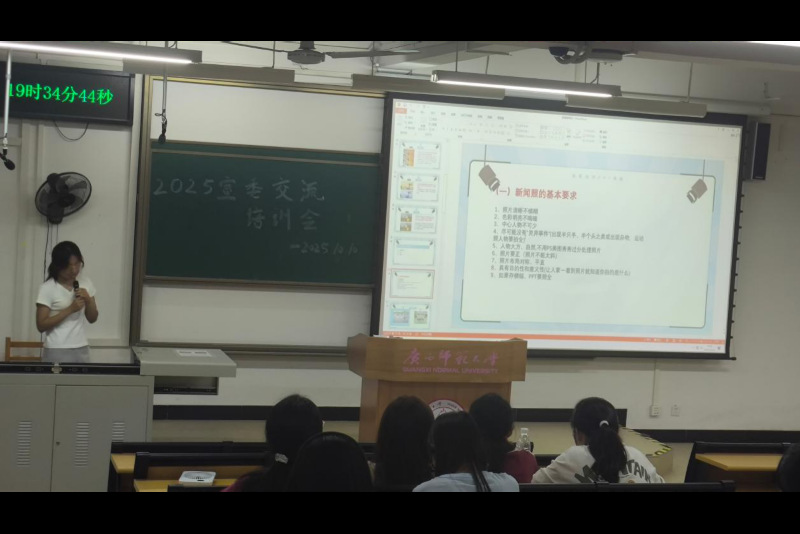 首先,数学与统计学院融媒体中心编辑部部长黄彩净对班级宣传推文的内容和图片选取进行了说明,还指出学员们需加强与学校及学院其他宣传平台的互动,保持一定的活跃度。随后,融媒体新闻部副部长柒思羽围绕撰写新闻稿的要求展开讲解,说明了新闻稿的应具备的内容,以及主副标题字体设置等关键要素,并着重强调了新闻稿的时效性,该部分讲解配合丰富的图文案例,使学员们对撰写新闻稿有了更直观的理解。紧接着,影像部部长潘巍月以手机摄影与新闻图像处理为主题展开培训,内容涵盖手机拍摄功能解析、新闻摄影构图技巧、常用修图软件推荐等,并对专业拍摄模式中的参数设置作了详细讲解。最后,数学与统计学院分团委团务中心宣传部副部长蓝洪雨对绘制海报的主题,信息层级,视觉设计等作出详细说明,鼓励同学们尽快掌握相关技能。