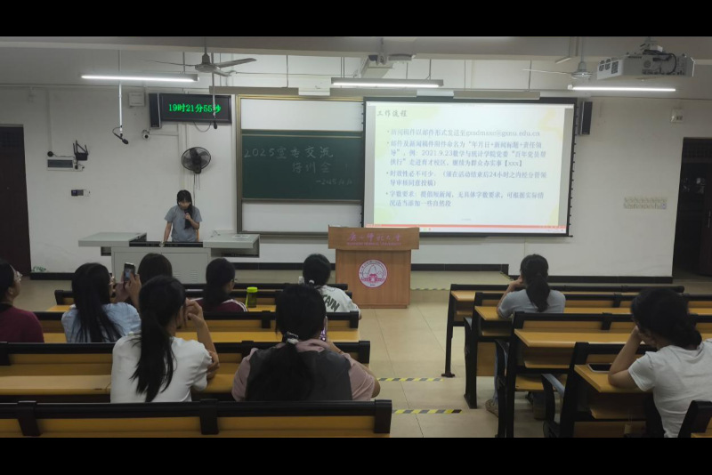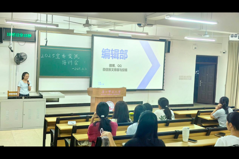 为提升各班级宣传委员的综合能力,进一步加强新闻宣传工作的规范性。2025 年10月10日晚19:10,数学与统计学院于雁山校区理科四区204教室成功开展2025年宣委交流培训会。本次培训会特邀数学与统计学院分团委团务中心宣传部与数学与统计学院融媒体宣传中心部长担任主讲,面向2025级各班宣传委员及各学生组织、协会宣传负责人开展系统培训。