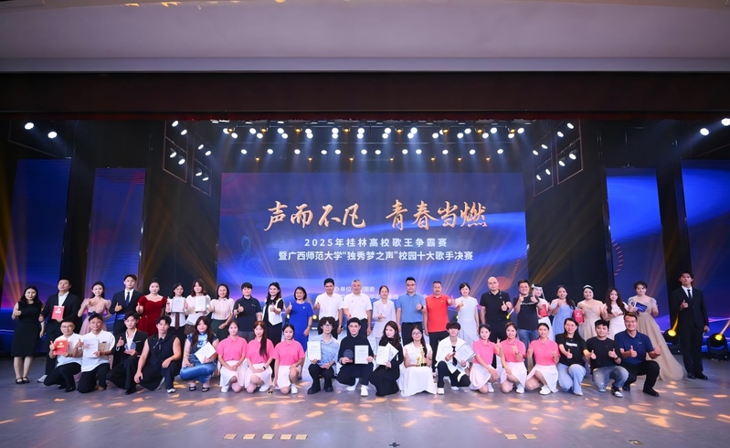 最终荣誉揭晓时刻,全场目光聚焦舞台:我校音乐学院姚春彤凭借稳定的现场发挥与过硬的专业功底,一举拿下校园十大歌手冠军与桂林高校“歌王”冠军荣誉;韦子欢以深情唱腔获校园十大歌手亚军,韦丁尹凭灵动演绎摘得季军,秦世杰、蒙炫鹏、聂曦雅、胡艺纯、蔡彬本、白鑫源、韦其才7位同学一并获得校园十大歌手称号;桂林理工大学陈汝琳、桂林学院黎文幸分别获2025年桂林高校歌王争霸赛亚军和季军。