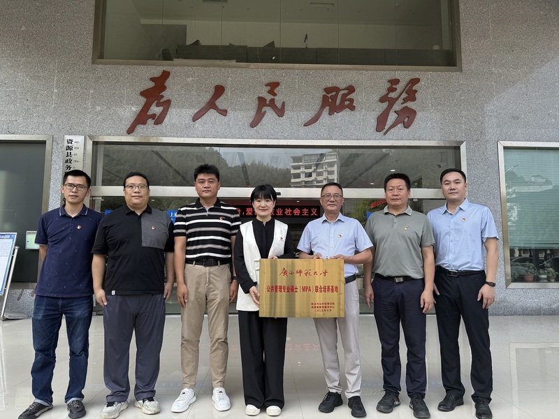 广西师范大学政治与公共管理学院与资源县共建公共管理专业硕士(MPA)联合培养基地挂牌仪式于10月17日上午在资源县政务服务中心圆满举行。学院院长周超、党委副书记钟景清、副院长张雄和相关教师出席仪式。资源县挂职县委常委、副县长魏婷婷,挂职县委常委、副县长、驻村工作队队长贾越峰及相关部门负责同志共同参加仪式。
