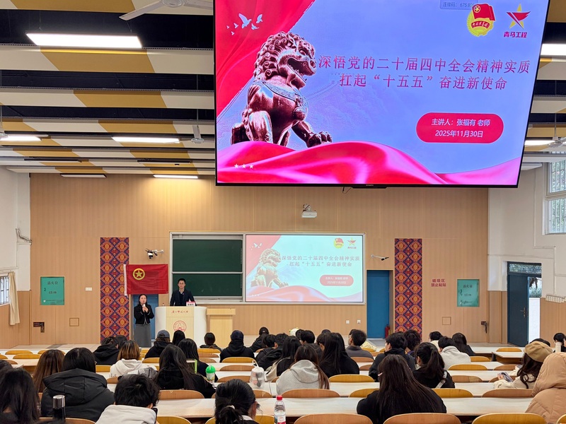 为深入学习党的二十届四中全会精神,精准把握全会的核心要义与实践要求,11月30日,政治与公共管理学院在文一区108教室成功举办了“深悟党的二十届四中全会精神实质,扛起‘十五五’奋进新使命”专题理论学习活动。本次活动特邀学校马克思主义学院师资博士后张福有老师担任主讲嘉宾,学院青马学员、党的发展对象、入团积极分子等200余名师生踊跃参与。