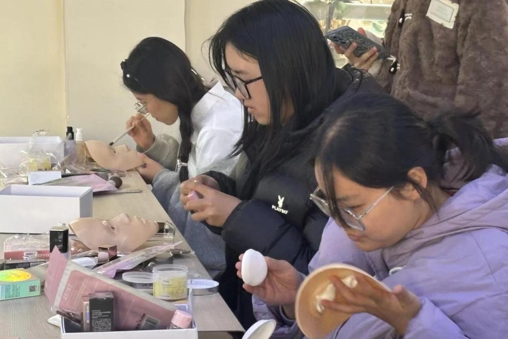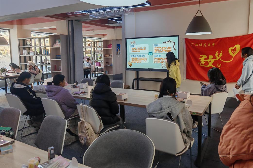 在职业形象环节,分享嘉宾通过PPT演示,从底妆、眼妆、修容三个方面详细讲解化妆技巧,并结合不同肤质与脸型特点,分享美妆产品的选用方法。随后,同学们分组进行实操练习,逐步掌握基本化妆技能。在职场穿着礼仪部分,分享嘉宾系统介绍了着装原则与场景搭配要领。自由交流环节中,活动参与者积极分享美妆心得与穿搭经验,围绕常见问题展开热烈讨论。