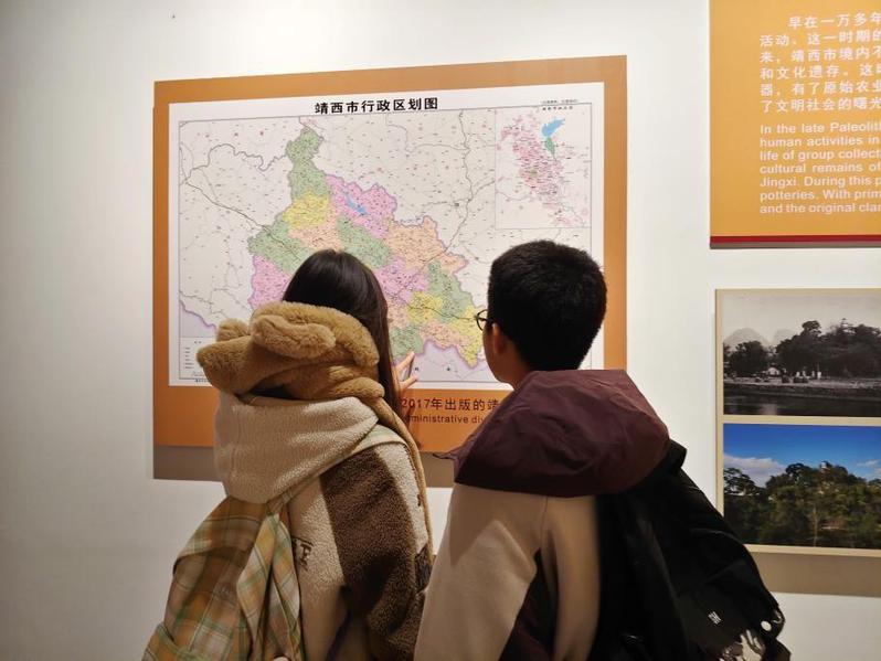 图为团队成员考察博物馆展陈的靖西市行政区划图