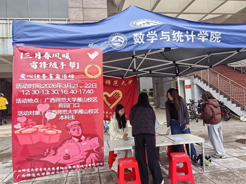 2026年3月21日,22日12:30—13:30,16:40—17:40,由共青团广西师范大学数学与统计学院委员会主办,青年志愿者协会数统分会与红十字分会数统分会承办的“雷锋随手帮”爱心任务盲盒活动在雁山校区荷园门口顺利开展。本次活动面向雁山校区150名本科生,旨在通过抽取爱心任务盲盒、完成微小善举的形式,践行雷锋精神,传递校园温暖。